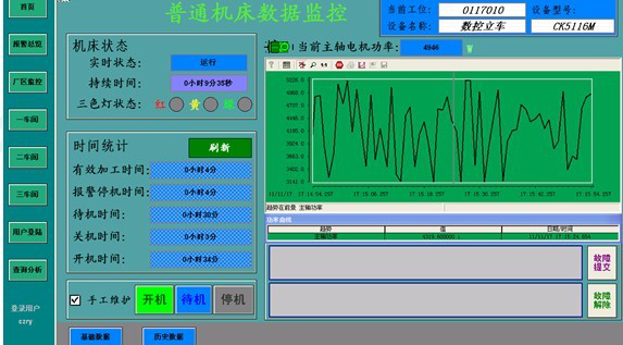 在后臺計算機上,管理人員可查看各臺機床設備工作時間段的曲線和實時工況棒圖。曲線保存時間根據(jù)用戶要求可以設定,一般保存兩年,采取自動覆蓋方式。