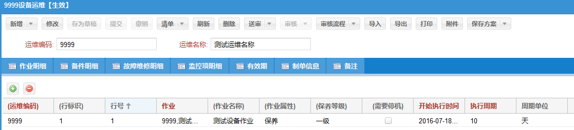 設備作業(yè)計劃涉及設備停機,管理員在后臺管理系統(tǒng)中能自動將需要進行維護作業(yè)的所有設備在檢修計劃中顯示。在檢修計劃中柔性地安排各設備作業(yè)計劃,合理地將需要停機檢修的設備統(tǒng)一安排成新的檢修計劃。檢修計劃的設備作業(yè)將自動覆蓋原先作業(yè)計劃的設備作業(yè),避免造成同一周期內(nèi)同一設備重復同樣的作業(yè)計劃。并且一個檢修計劃內(nèi)未完成的任務可以納入到下一次的停機檢修計劃中去。系統(tǒng)確保所有計劃井井有條的進行。檢修計劃實時顯示設備作業(yè)計劃進度。此步驟非必要步驟,可按實際需求進行選擇性操作。